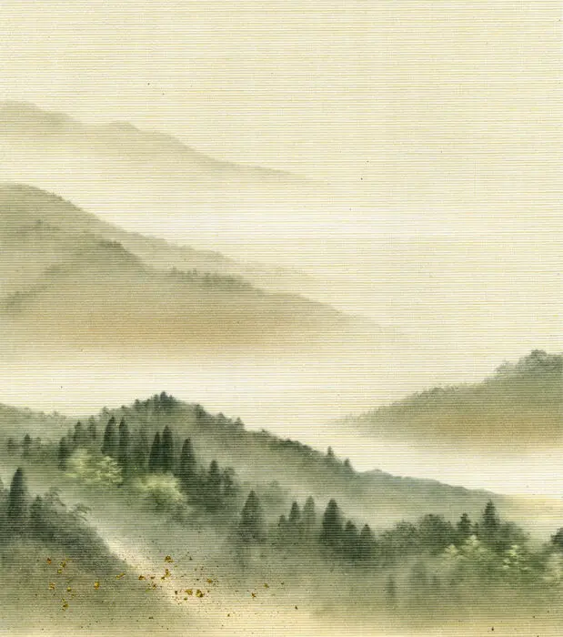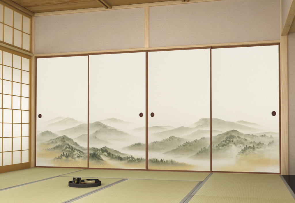 雄大な山並みが空間の広がりを感じさてくれる絵柄で仕上げてあります。